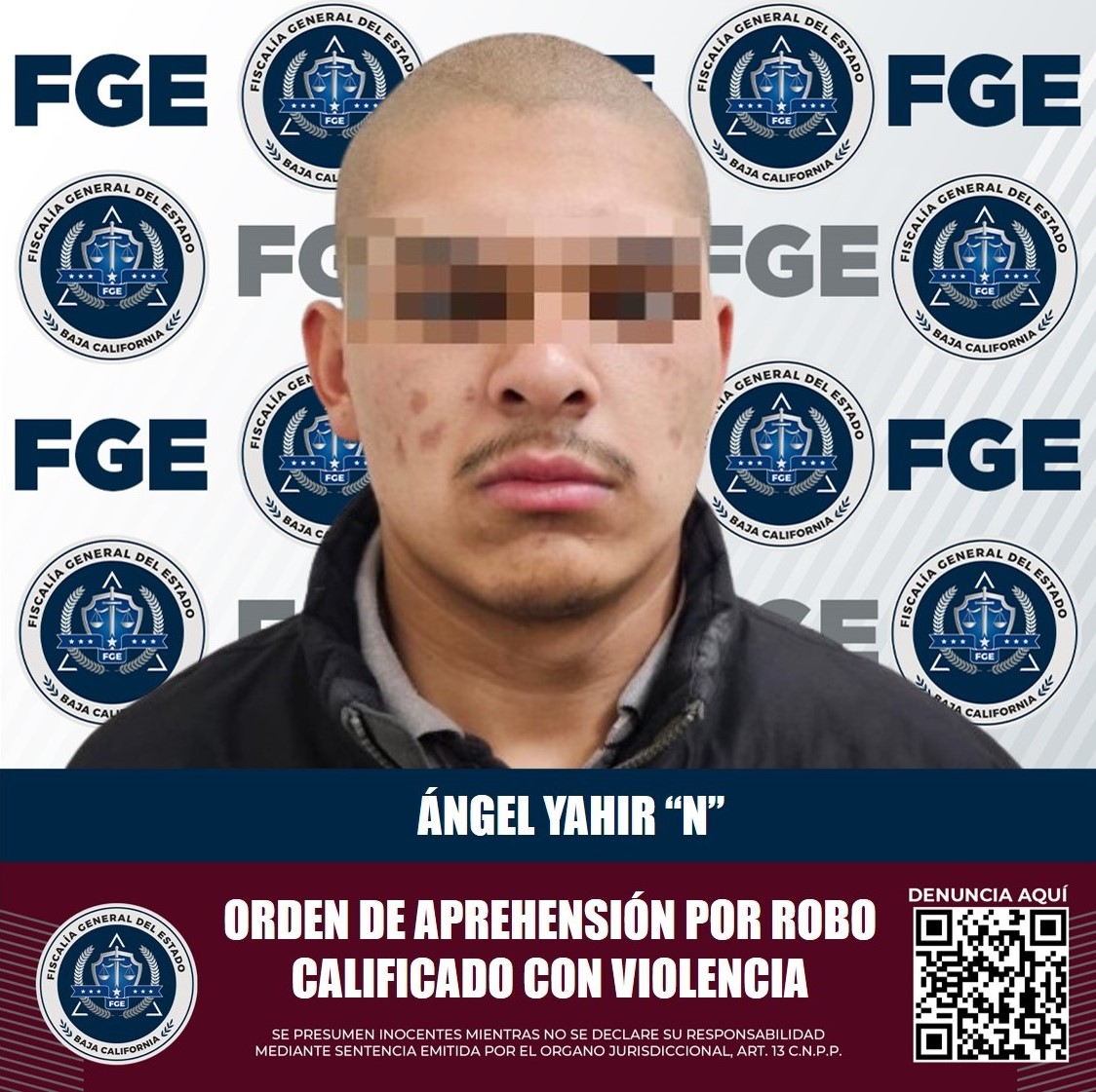 TIJUANA, B.C. A Ángel Yahir “N”, quien es señalado como probable responsable del delito de robo calificado ejecutado con violencia, le fue cumplimentada una orden de aprehensión por elementos de la Agencia Estatal de Investigación de la Fiscalía General del Estado.
