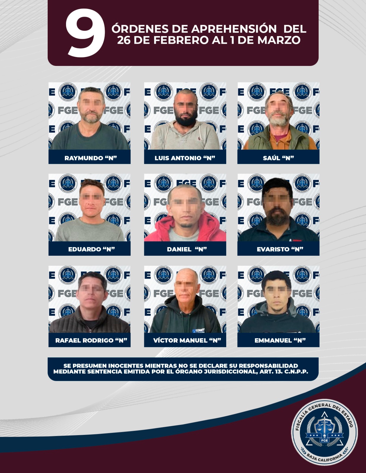TECATE, B.C. A través de acciones de investigación llevadas a cabo por elementos de la Agencia Estatal de Investigación de la Fiscalía General del Estado se logró la cumplimentación de 9 órdenes de aprehensión por diversos delitos, del 26 de febrero al 1 de marzo de 2024.