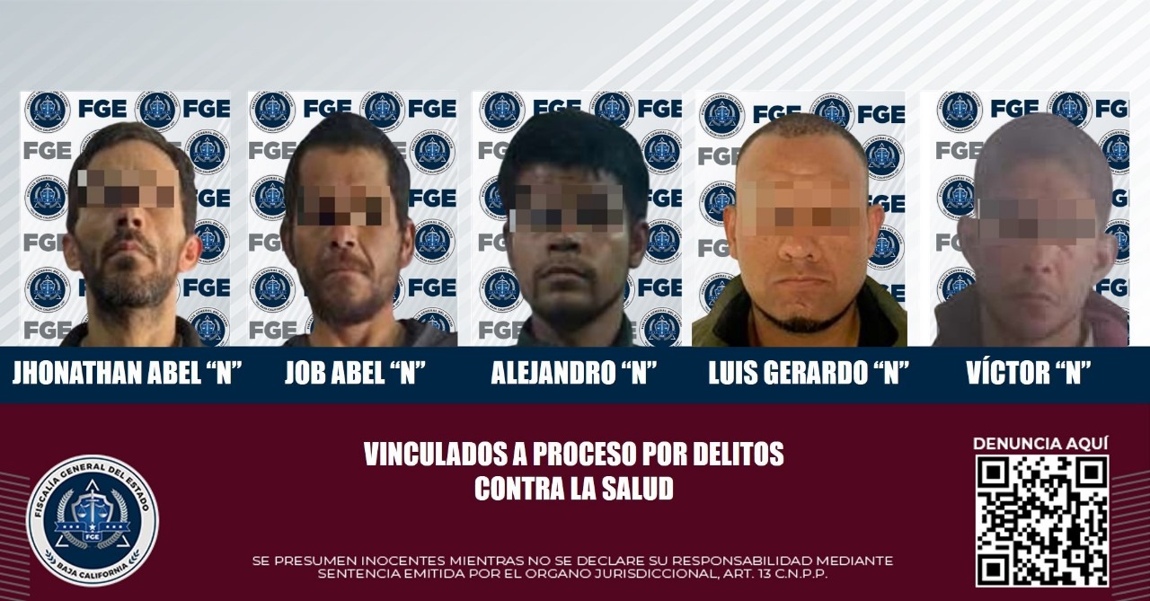 TIJUANA, B.C. La Fiscalía General del Estado informa que, cinco imputados por delitos contra la salud en la modalidad de narcomenudeo, fueron vinculados a proceso penal, luego de que el Ministerio Público presentó los elementos de prueba para que los jueces de control determinaran iniciar procesos en su contra.
