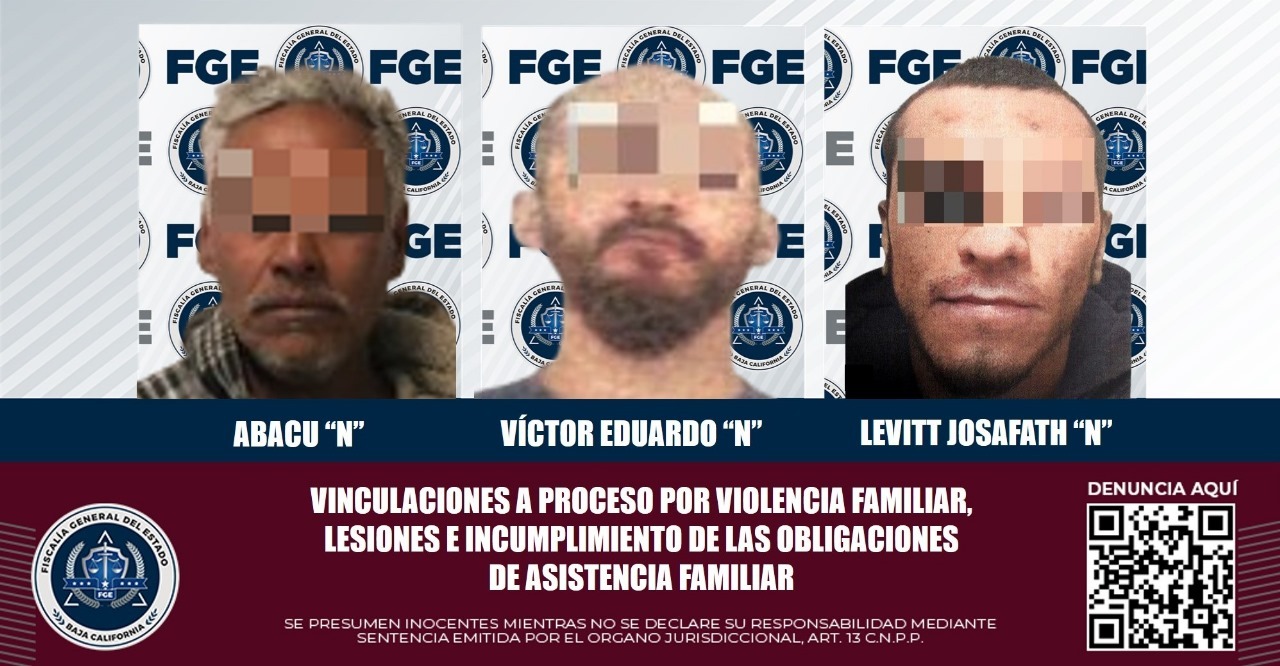 TECATE, B.C. La Fiscalía Regional de Tecate informa sobre la vinculación a proceso de tres hombres, quienes, en casos distintos, fueron llevados ante jueces de control por los delitos de violencia familiar, lesiones e incumplimiento de las obligaciones de asistencia familiar.