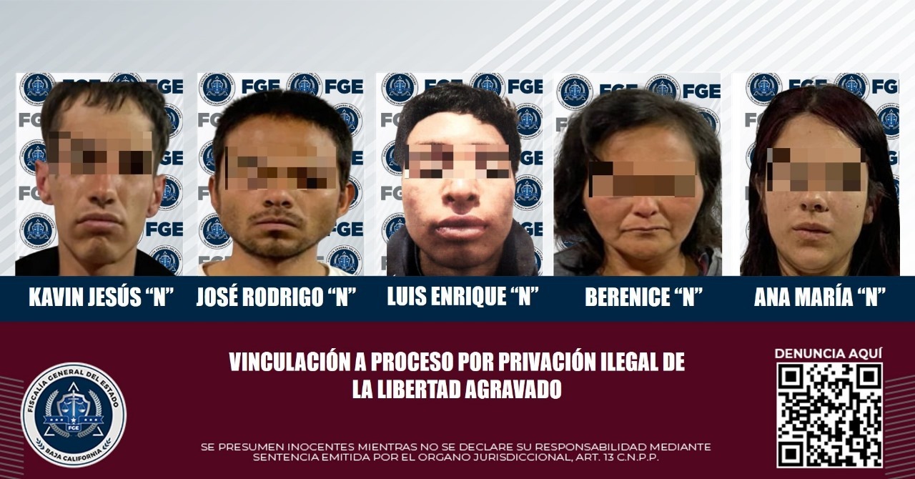 TIJUANA, B.C. Con base en argumentos y datos de prueba, la Fiscalía Regional de Tijuana acreditó la presunta responsabilidad de tres hombres y dos mujeres en el delito de privación ilegal de la libertad agravado. Quedaron vinculados a proceso con medida cautelar de prisión preventiva justificada.