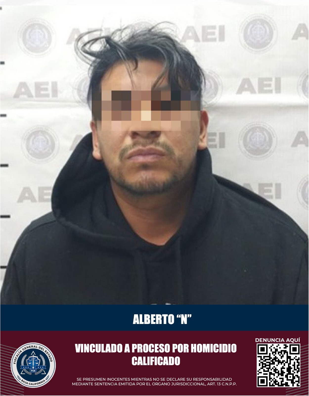 MEXICALI, B.C. La Fiscalía Especializada en Delitos Contra la Vida, informa que obtuvo la vinculación a proceso en contra de Alberto “N”, quien presuntamente cometió el delito de homicidio calificado.