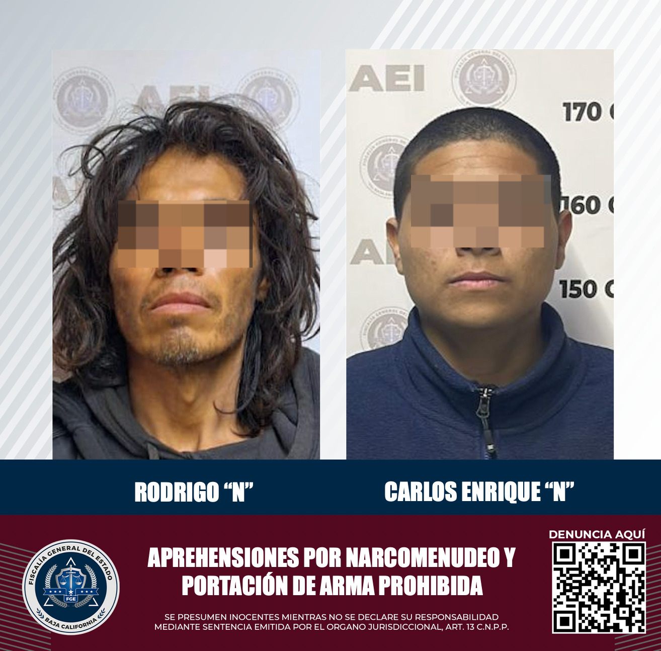 ENSENADA, B.C. Agentes Estatales de Investigación, en distintas zonas del municipio, aprehendieron a dos sujetos sobre los que pesaban mandatos judiciales por los delitos de portación de arma prohibida y narcomenudeo.