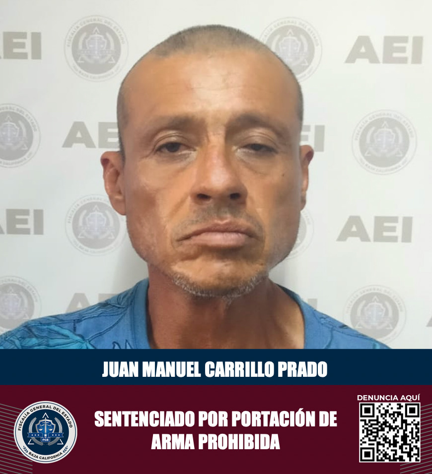 ENSENADA, B.C. Por el delito de portación de arma prohibida, la Fiscalía Regional de Ensenada obtuvo una sentencia de cuatro meses de prisión contra Juan Manuel Carrillo Prado.