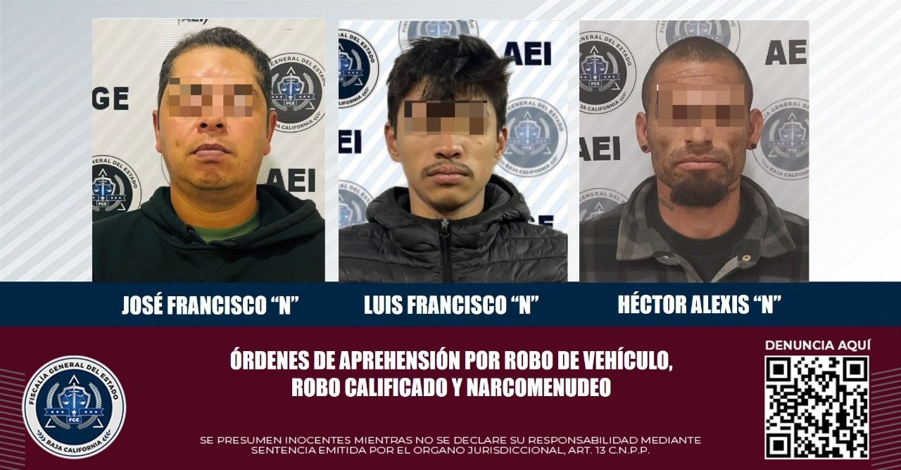 TIJUANA, B.C. La Fiscalía General del Estado puso a disposición de jueces de control a tres sujetos, una vez que elementos de la Agencia Estatal de Investigación (AEI) cumplimentaron las órdenes de aprehensión por los delitos que se les imputan.