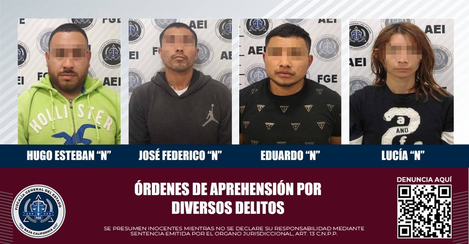 TIJUANA, B.C. La Fiscalía General del Estado cumplimentó órdenes de aprehensión contra tres hombres y una mujer, quienes en expedientes penales distintos son señalados por lesiones, robo calificado y robo de vehículo.