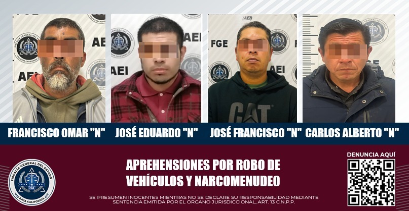 TIJUANA, B.C. La Fiscalía General del Estado, a través de la Agencia Estatal de Investigación, ha llevado a cabo la ejecución de cuatro órdenes de aprehensión emitidas por jueces de control, contra individuos acusados de diferentes delitos.