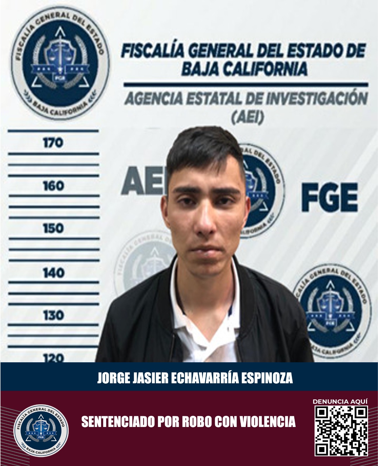 MEXICALI, B.C. La Fiscalía General del Estado, con base en los datos de prueba ofrecidos por el Ministerio Público, logró sentencia condenatoria en contra de Jorge Jasier Echavarría Espinoza, por el delito de robo con violencia.
