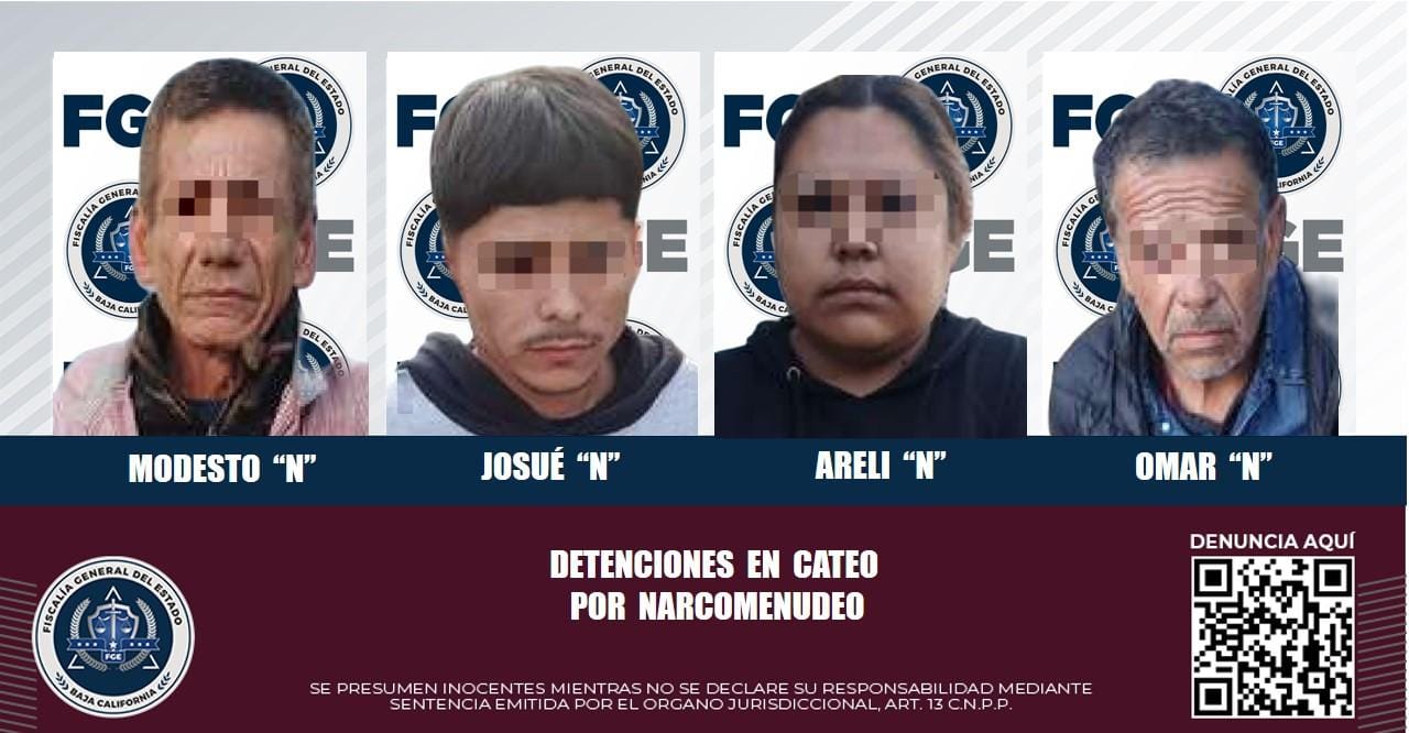 ENSENADA, B.C. Agentes de la Fiscalía General del Estado lograron la detención de cuatro personas, el decomiso de drogas y aseguramiento de un predio, tras cumplimentar una orden de cateo.