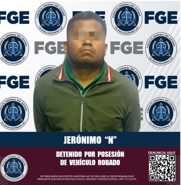 ENSENADA, B.C. Elementos policiales de la Fiscalía General de Baja California, aseguraron a Jerónimo ¨N¨, tras ser detectado a bordo de un vehículo de motor robado en el condado de San Diego, California.