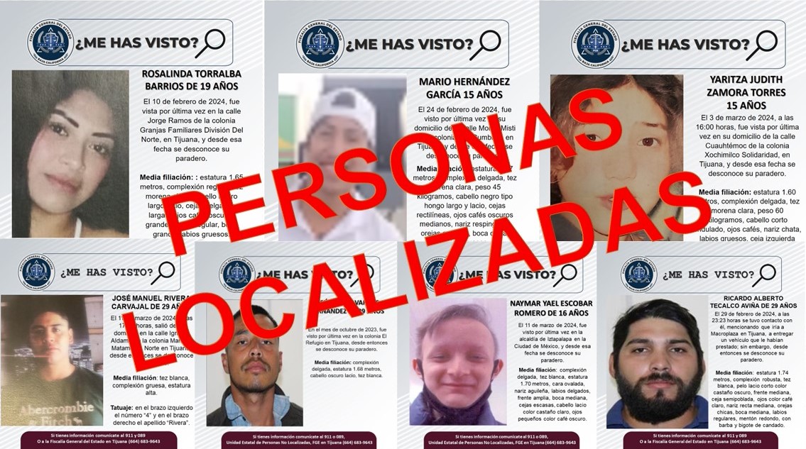 TIJUANA, B.C. La Fiscalía General del Estado (FGE) informa de la localización de siete personas que habían sido reportadas como desaparecidas. Este grupo, compuesto por dos mujeres y cinco hombres, entre ellos tres menores de edad, todos fueron hallados en condiciones de salud óptimas.