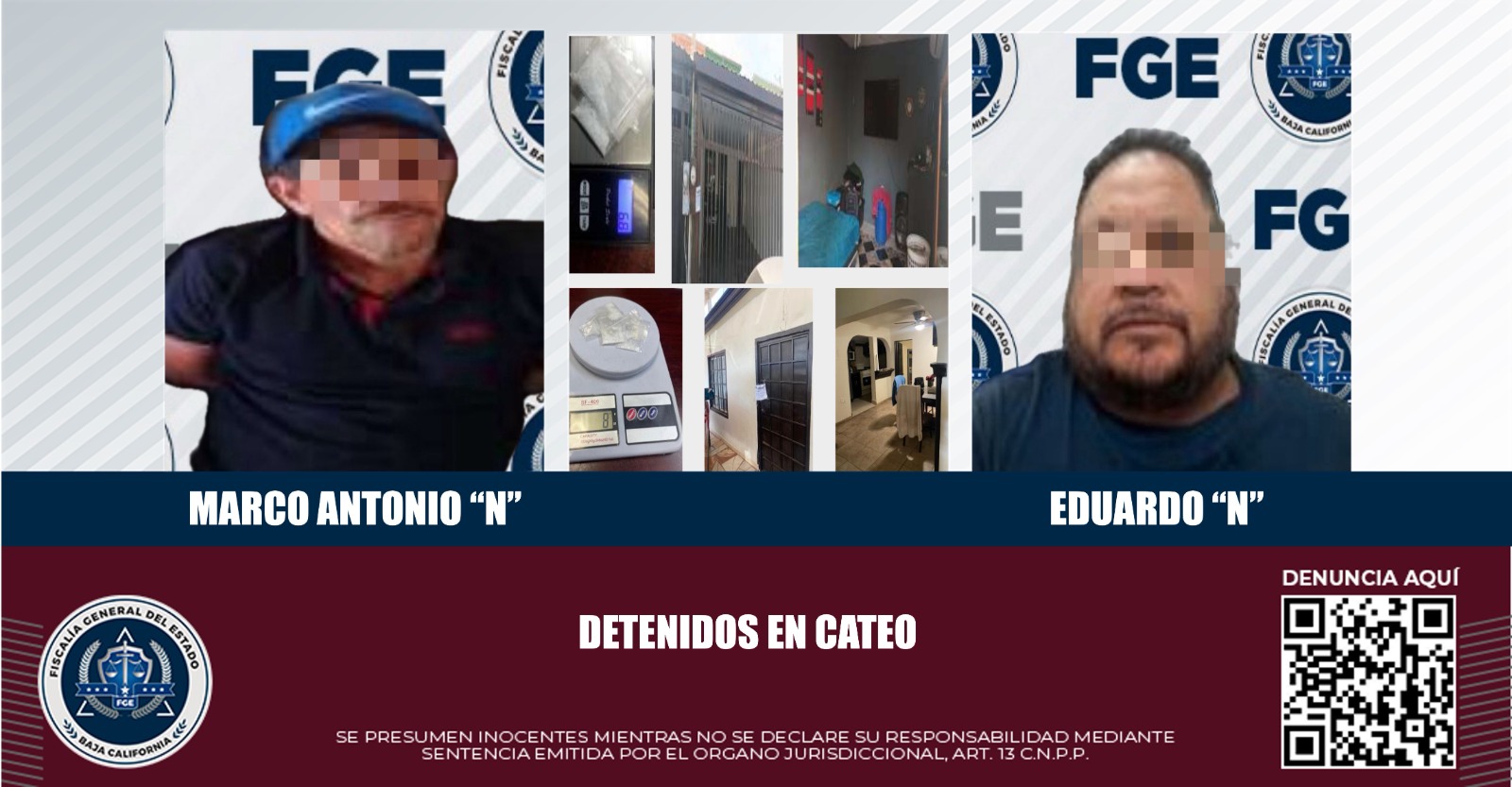 MEXICALI, B.C. La Fiscalía General del Estado, a través de elementos de la Agencia Estatal de Investigación, cumplimentó dos órdenes de cateo en diversos puntos de la ciudad, derivando en la detención de dos sujetos y el decomiso de droga, como resultado del trabajo desarrollado por la Fiscalía Especializada en Narcomenudeo.