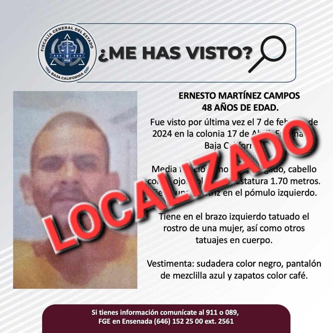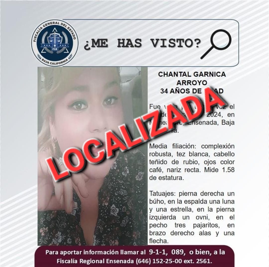 ENSENADA, B.C. La Fiscalía General del Estado cancela dos pesquisas generadas durante el mes en curso, para la localización de Chantal Garnica Arroyo de 34 años, y Ernesto Martínez Campos de 48 años de edad, ambos localizados con bien.