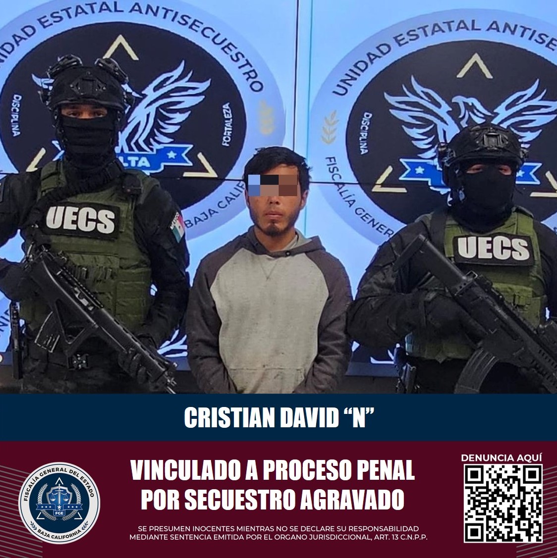 De acuerdo con las investigaciones, el 17 de marzo de 2024, Cristian David “N”, privó de la libertad a su pareja sentimental, junto con su menor hijo de 1 año 3 meses, en un domicilio de la colonia Vista Bella en Tijuana, ahí los mantuvo en cautiverio, causando lesiones con un cuchillo a la mujer en sus piernas y brazos, amenazándola con un arma de fuego, así como golpeando al menor, para exigir a sus familiares mediante llamadas telefónicas la cantidad de 300 mil pesos para liberarla o de lo contrario la mataría.