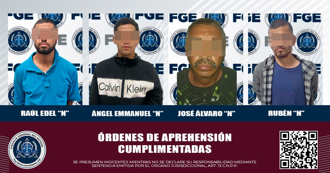 MEXICALI, B.C. Mediante el trabajo de investigación efectuado por elementos de la Agencia Estatal de Investigación (AEI) de la Fiscalía General del Estado, cuatro personas buscadas por contar con orden de aprehensión por el delito de robo de vehículo fueron detenidas.
