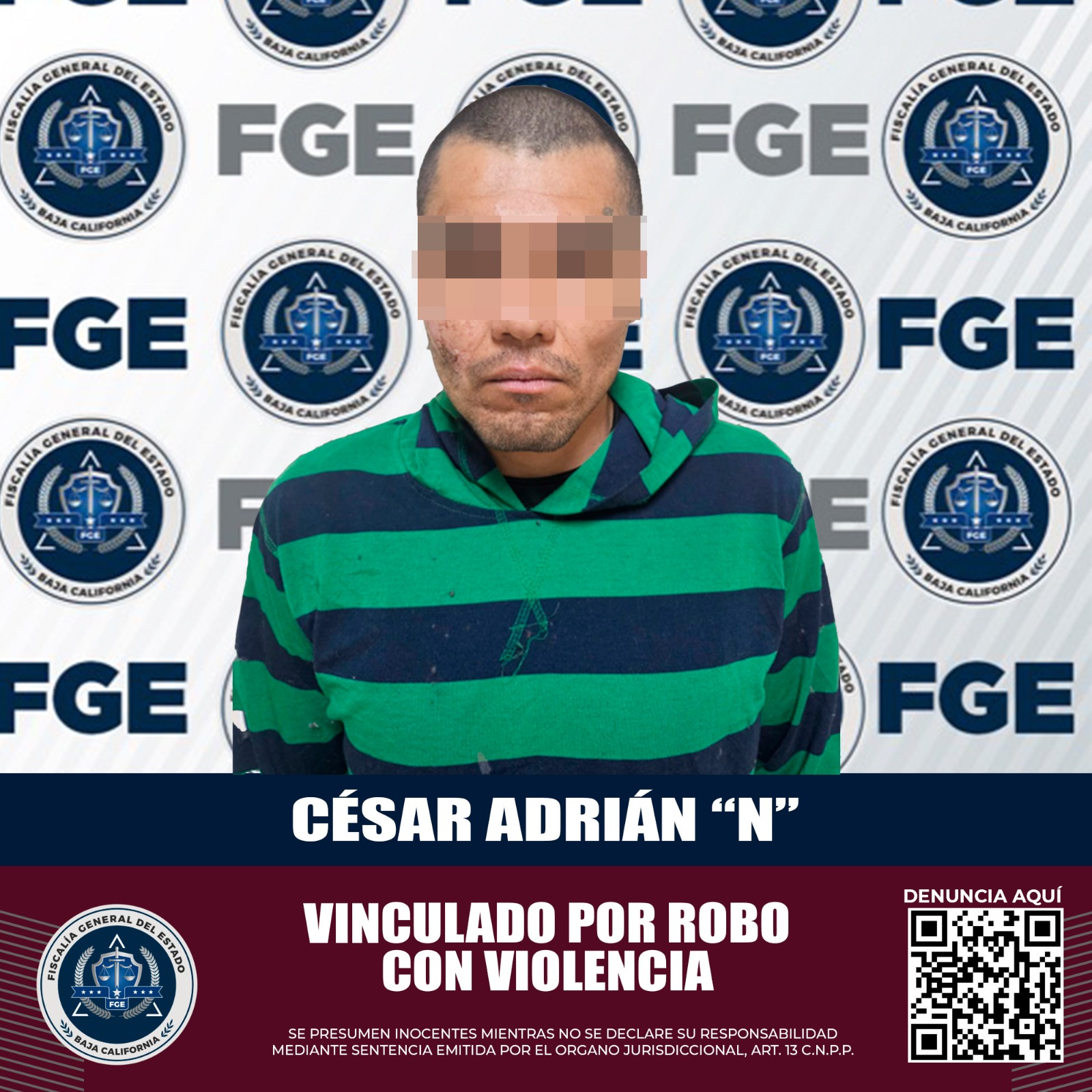 MEXICALI, B.C. La Fiscalía Regional de Mexicali, a través de la Unidad de Investigación de Robos Oriente, logró la vinculación a proceso de un hombre, presuntamente relacionado en un robo violento.