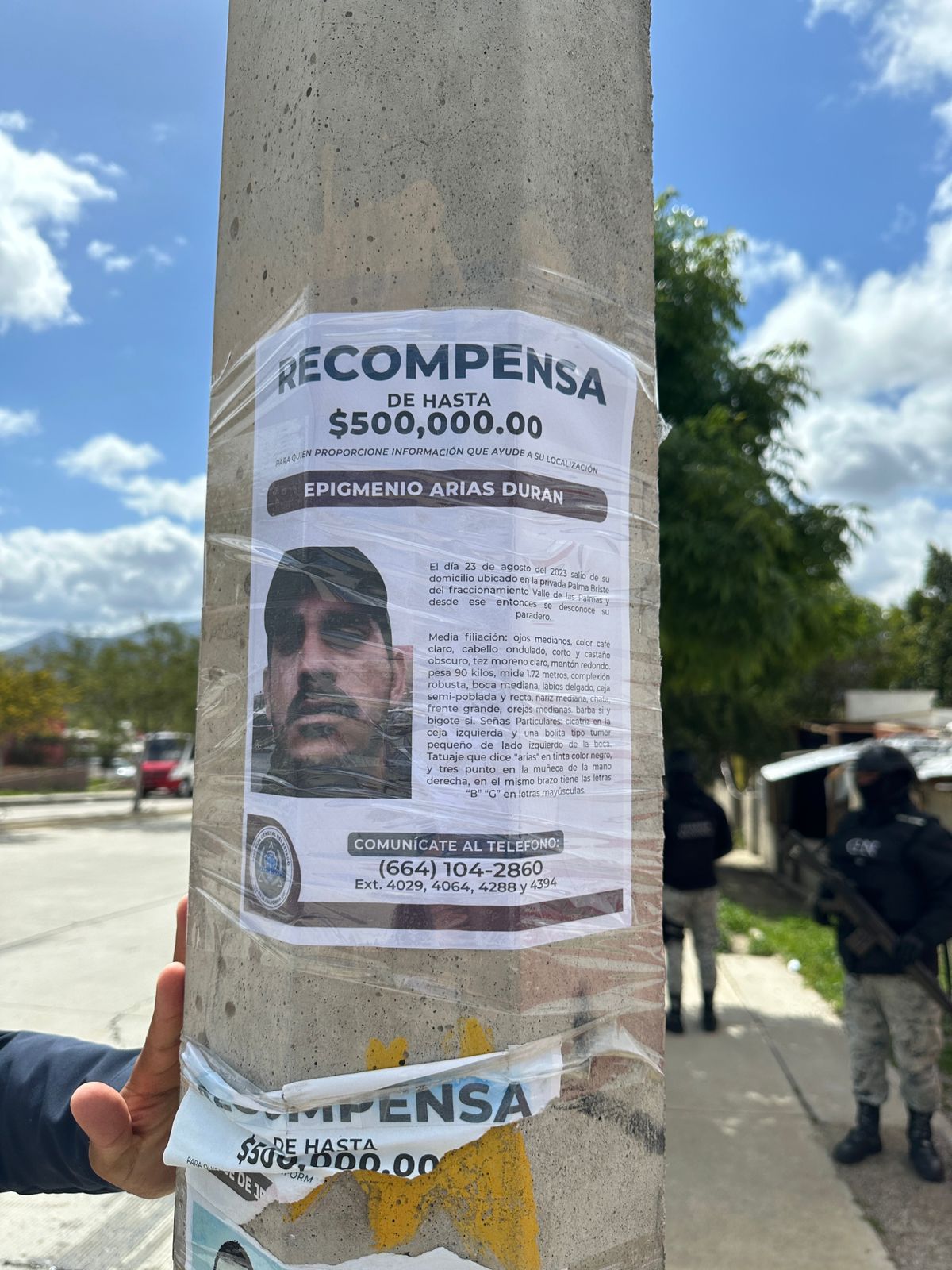 En Valle de las Palmas se colocaron volantes de recompensa con la fotografía e información de Epigmenio Arias Durán, quien fue visto por última vez el 23 de agosto de 2023 al salir de su domicilio en el fraccionamiento Valle de las Palmas.