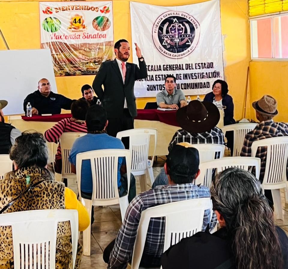 SAN QUINTÍN, B. C. Autoridades de la Fiscalía Regional de San Quintín asistieron a una reunión con copropietarios del poblado conocido como Ex Hacienda Sinaloa, situada al inicio de la jurisdicción del municipio de San Quintín.