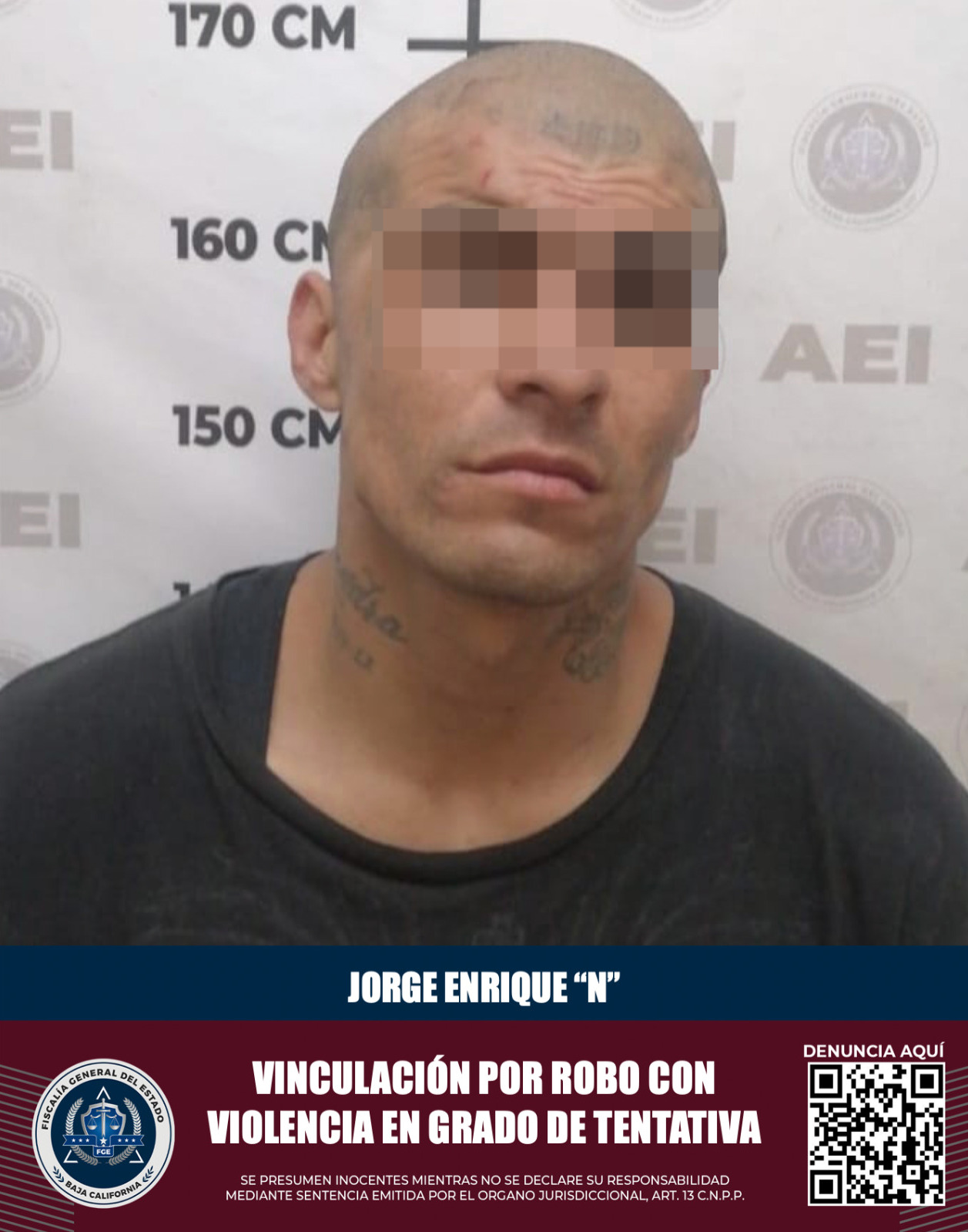 ENSENADA, B.C. La Fiscalía Regional de Ensenada, a través de elementos de prueba presentados por el agente del Ministerio Público, logró la vinculación a proceso de un presunto implicado en un intento de robo con violencia.