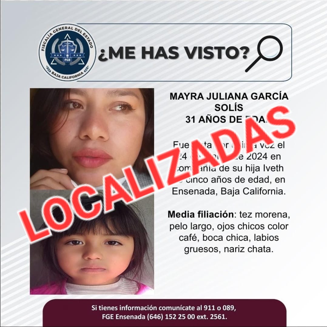 Por lo anterior, la FGE cancela la pesquisa de Mayra Juliana García Solís de 31 años y de la menor Ivette Barajas García de 5 años de edad.