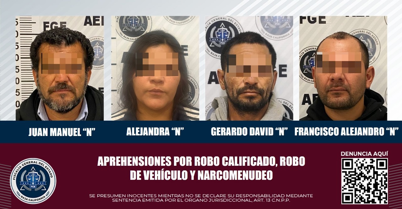TIJUANA, B.C. Elementos de la Unidad de Aprehensiones de la Fiscalía General del Estado han detenido a cuatro personas, sobre quienes pesaban mandatos judiciales por diversos delitos, por robo calificado, robo de vehículo y delitos contra la salud en su modalidad de narcomenudeo.