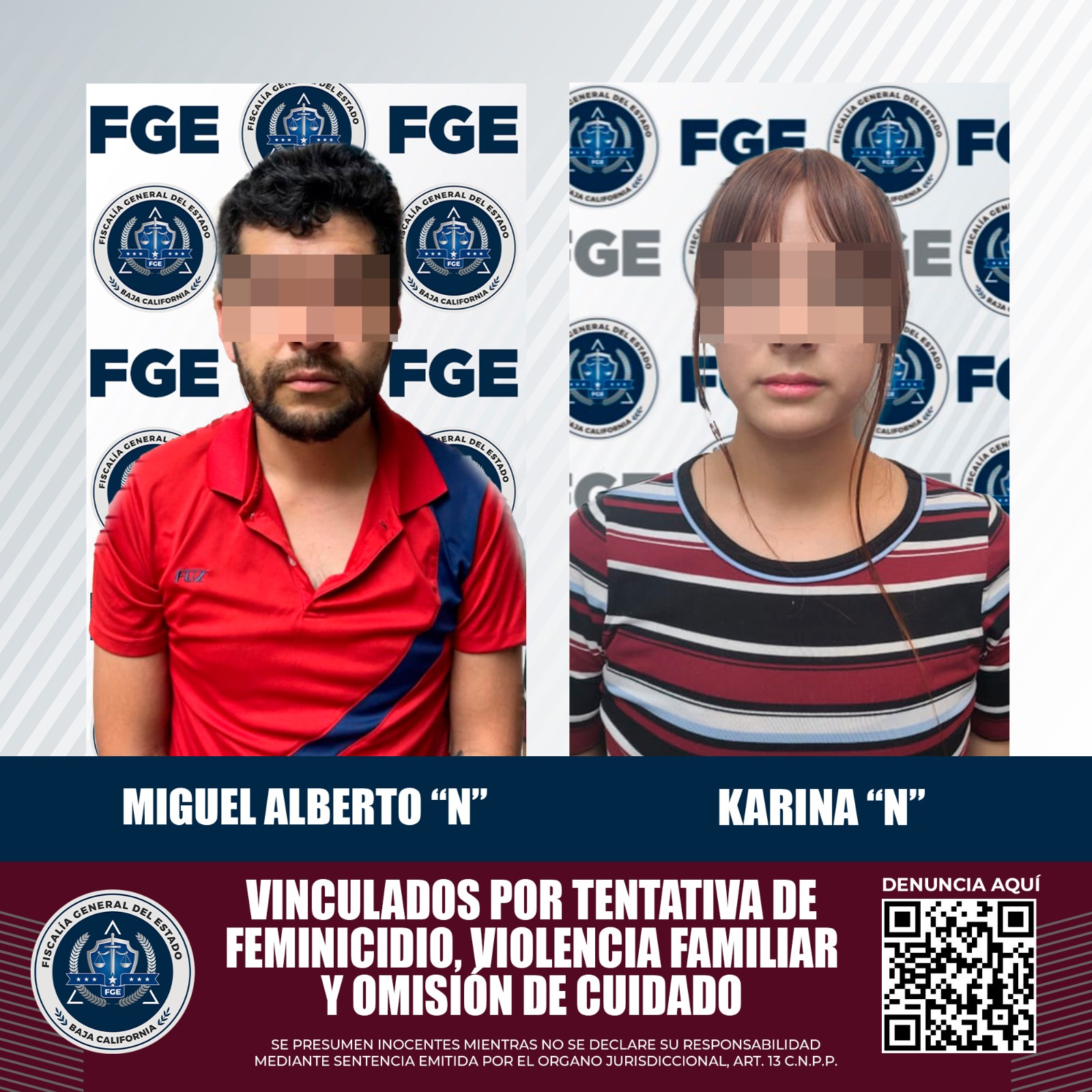 MEXICALI, B.C. Con base en la correcta integración de la carpeta de investigación, la Fiscalía General del Estado, obtuvo la vinculación a proceso de un hombre y una mujer, presuntos responsables de los delitos de feminicidio en grado de tentativa, violencia familiar y omisión de cuidado.