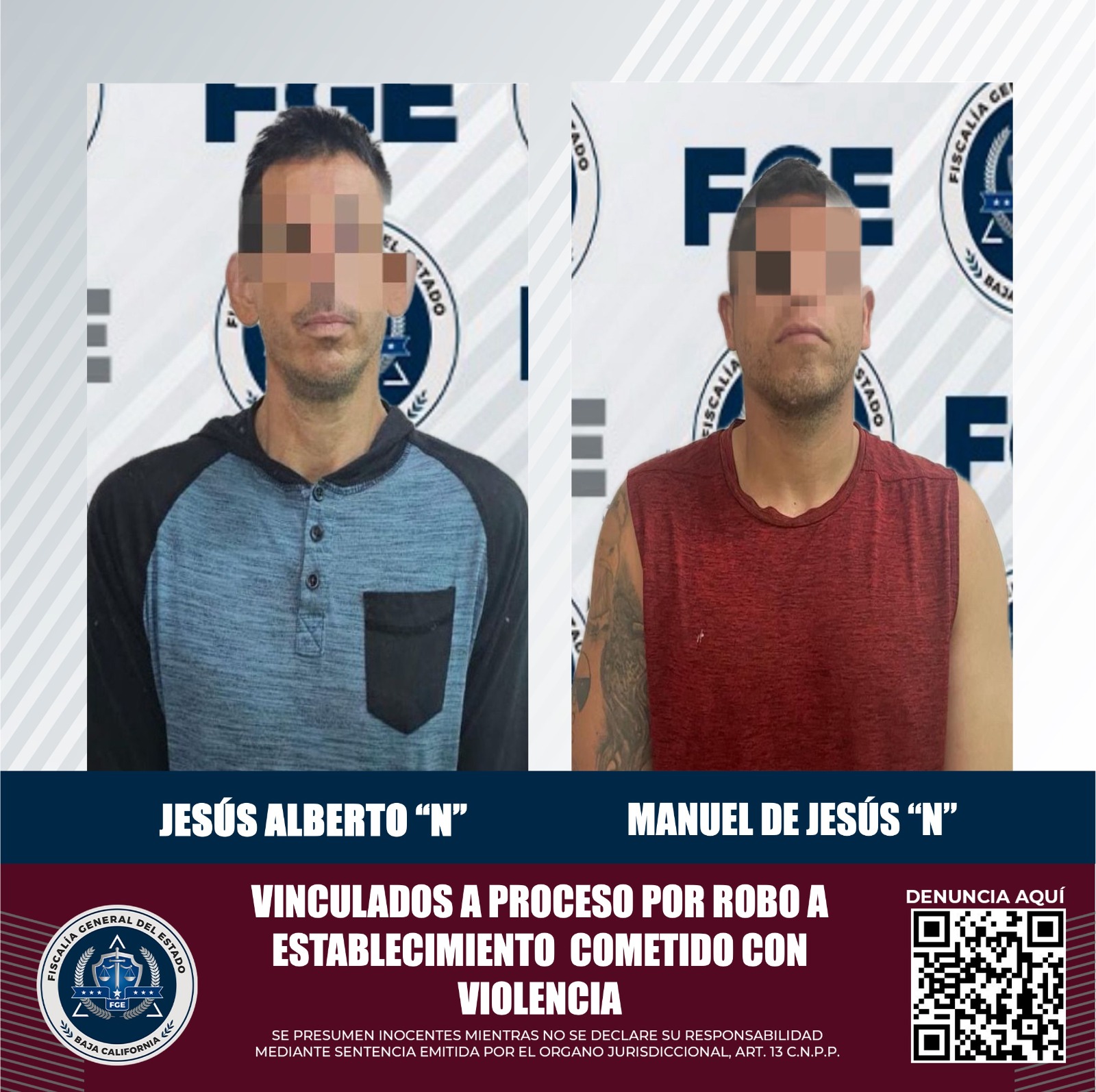 MEXICALI, B.C. La Unidad de Investigación de Robos Oriente de la Fiscalía Regional de Mexicali obtuvo en audiencias por separado la vinculación a proceso de dos hombres, presuntamente responsables del delito de robo calificado a establecimiento comercial abierto al público con violencia, en hechos distintos.