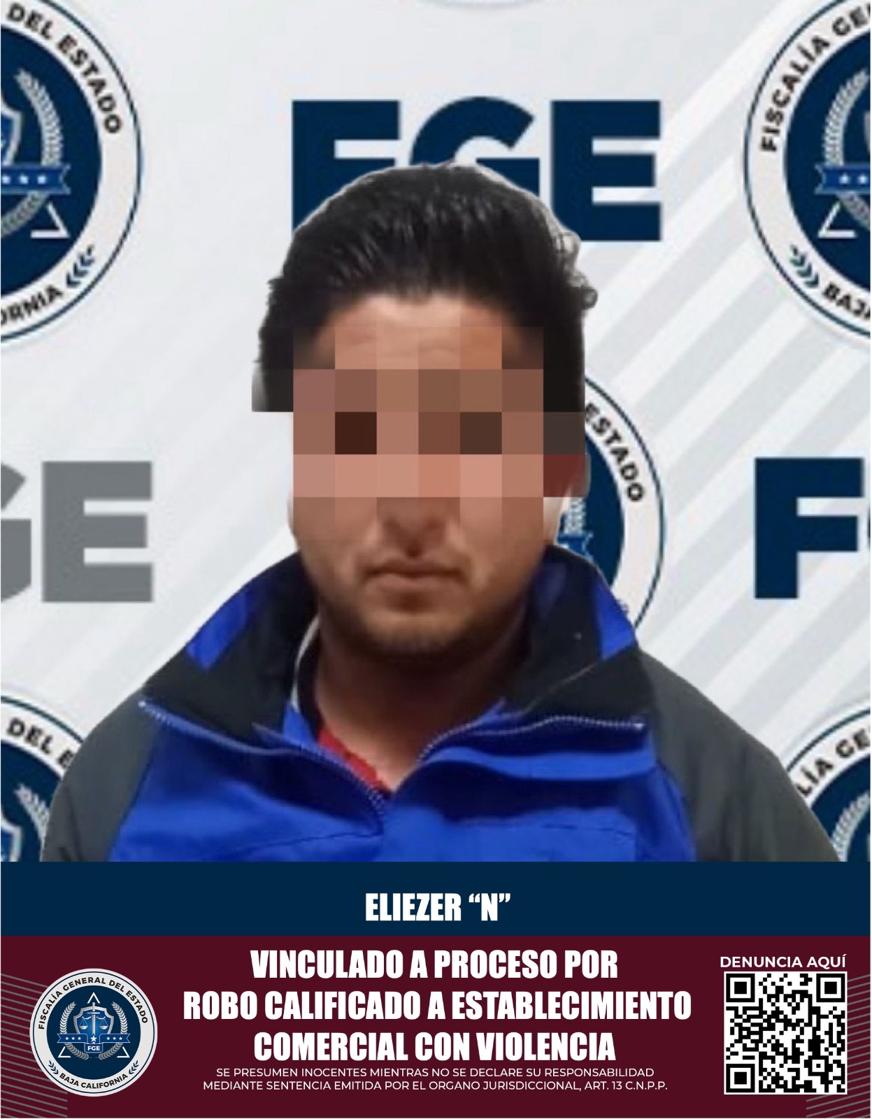 MEXICALI, B.C. La Fiscalía Regional de Mexicali, a través del trabajo realizado por la Unidad de Investigación de Delitos de Robos Poniente, en la integración de la carpeta de investigación, obtuvo la vinculación a proceso de Eliezer “N”, quien presuntamente cometió el delito de robo calificado a establecimiento comercial abierto al público con violencia.
