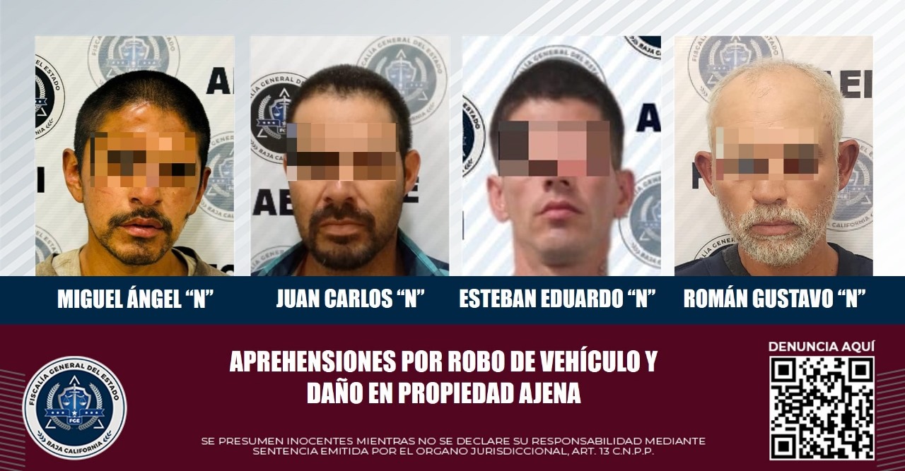 TIJUANA, B.C. Tras desarrollar labor de investigación, cuatro individuos con orden de aprehensión, tres investigados por robo de vehículo y uno por daño en propiedad ajena, fueron detenidos por elementos de la Agencia Estatal de Investigación (AEI) de la Fiscalía General del Estado (FGE).
