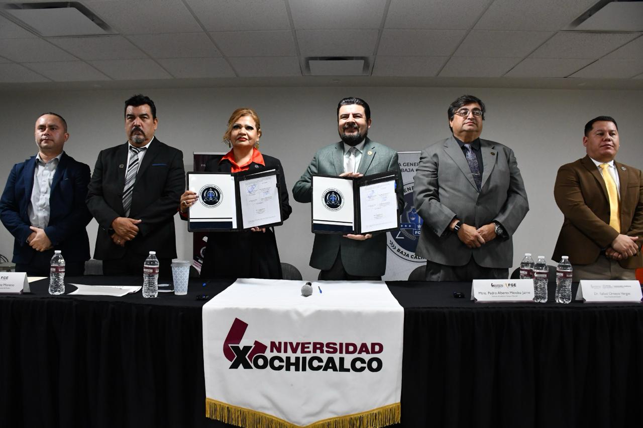 MEXICALI, B.C. La Fiscalía General del Estado y la Universidad Xochicalco, firmaron un convenio de colaboración con el objetivo de contribuir en la formación teórico-práctica de los estudiantes, así como brindar oportunidades de becas a hijos de los servidores públicos de la FGE.