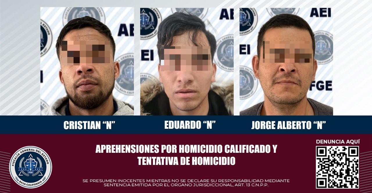 TIJUANA, B.C. Tres sujetos señalados como presuntos participantes en los delitos de homicidio calificado con ventaja y homicidio calificado en grado de tentativa, fueron capturados por elementos de la Agencia Estatal de Investigación (AEI) en Tijuana, por contar con órdenes de aprehensión en su contra.