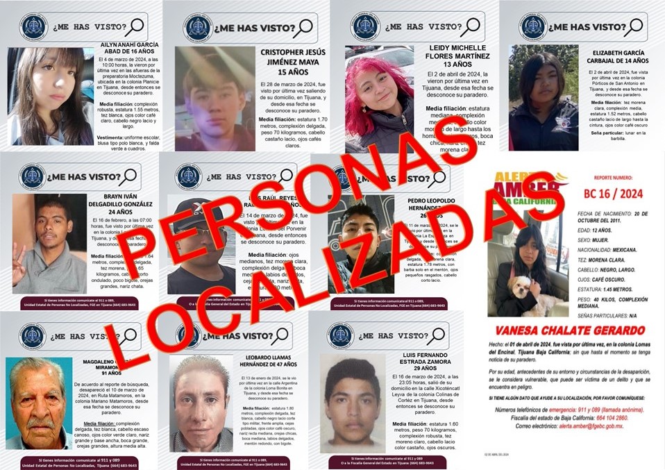 TIJUANA, B.C. La Fiscalía General del Estado (FGE) informa de la localización de once personas que habían sido reportadas como desaparecidas, y en uno de los casos se había activado la Alerta Amber. Este grupo, compuesto por cuatro mujeres y siete hombres, entre ellos cinco menores de edad, fue hallado en condiciones óptimas de salud.