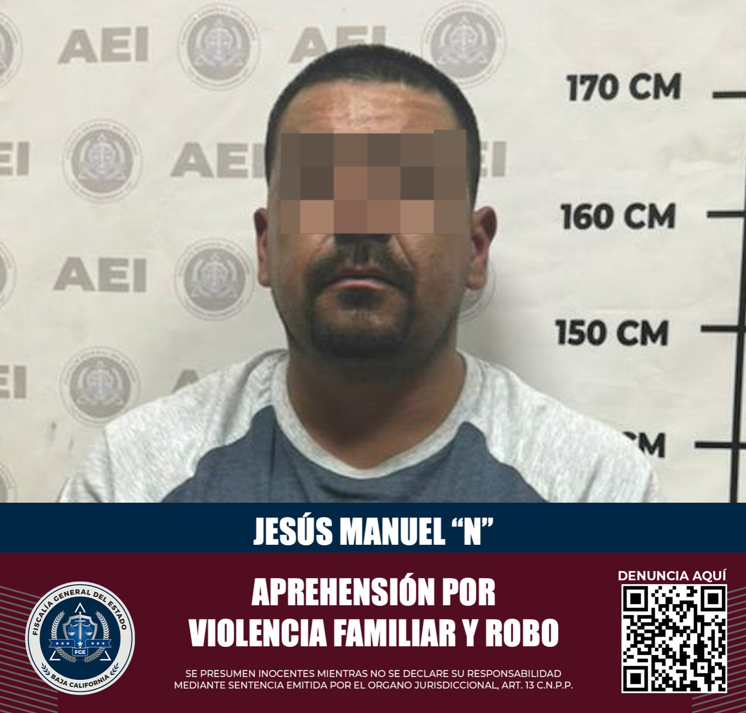 ENSENADA, B.C. 11 DE ABRIL DE 2024.- La Fiscalía General del Estado cumplimentó una orden de aprehensión contra Jesús Manuel “N”, como resultado de labor realizada por la Unidad de Investigación en Francisco Zarco, en relación a una denuncia por los delitos de violencia familiar y robo.