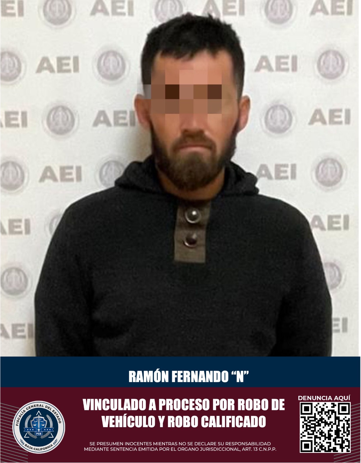 MEXICALI, B.C. La Unidad de Investigación de Robo de Vehículo, de la Fiscalía Regional de Mexicali, presentó los argumentos y pruebas necesarias para se obtuviera la vinculación a proceso en contra de Ramón Fernando “N”, quien presuntamente cometió los delitos de robo de vehículo con violencia y robo calificado.
