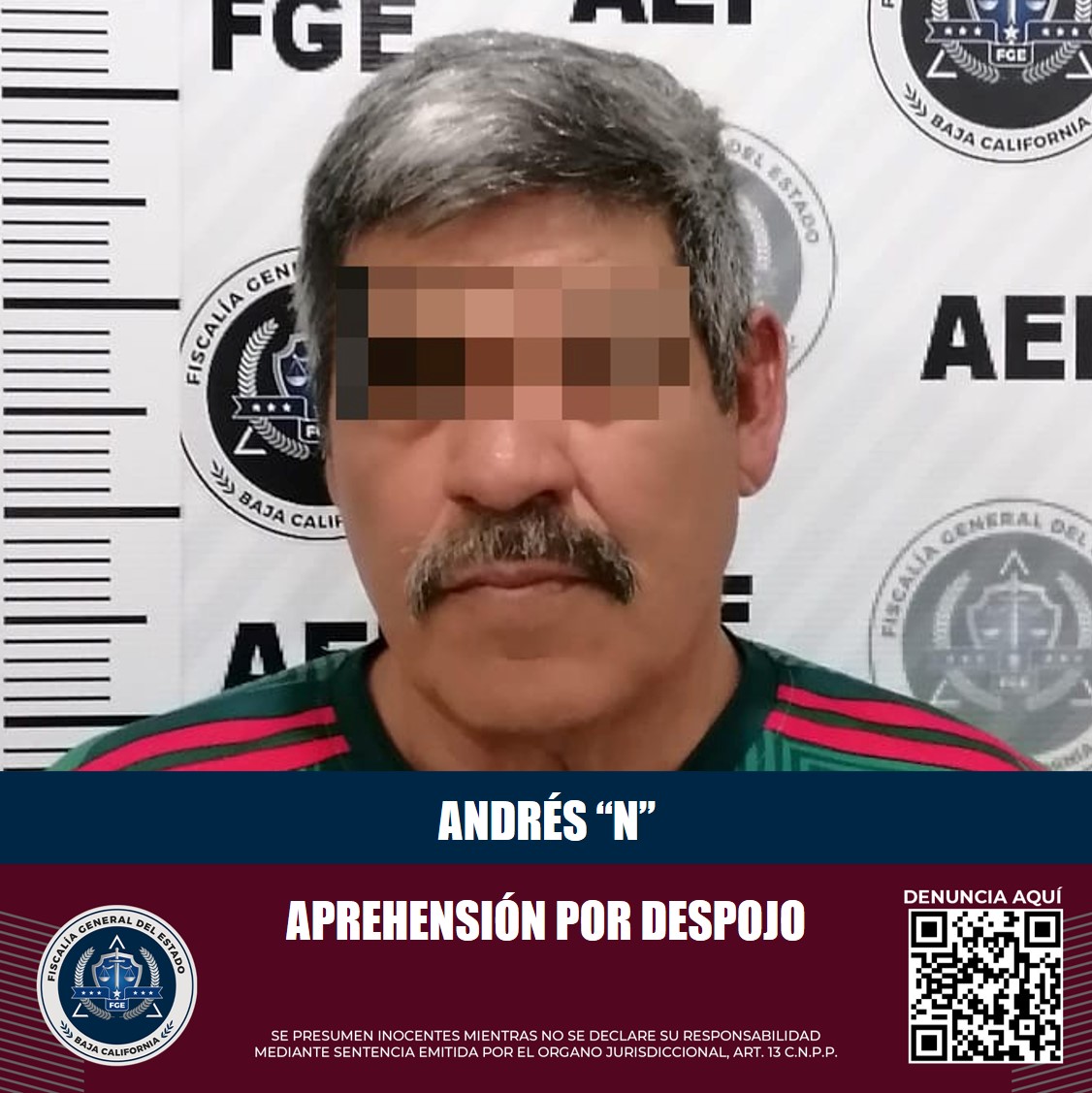 TIJUANA, B.C. La Fiscalía General del Estado, a través de la Agencia Estatal de Investigación, cumplimentó un mandamiento judicial contra Andrés “N”, acusado del delito de despojo.