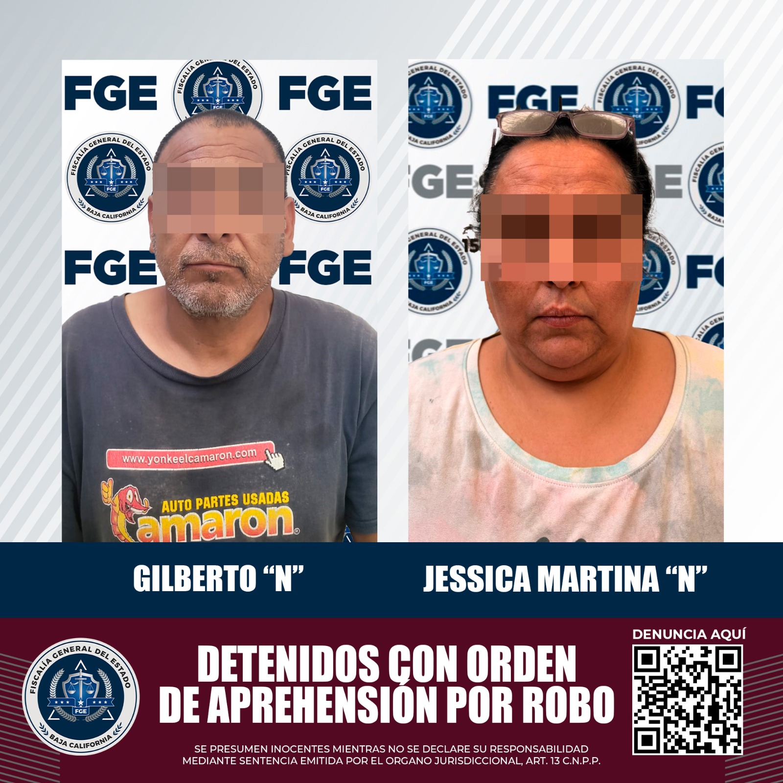 Los detenidos, Gilberto “N” y Jessica Martina “N”, fueron localizados en la ciudad de Tijuana. Están presuntamente relacionados en un hecho delictivo ocurrido el 20 de marzo de 2023, en un tianguis ubicado en Calzada San Miguel El Grande, de la colonia Hidalgo.