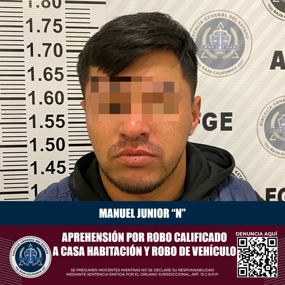 TIJUANA, B.C. Por los delitos de robo calificado a casa habitación y robo de vehículo de motor, ambos ejecutados con violencia, un hombre fue detenido y puesto a disposición de un Juez de Control, mientas avanza la investigación que lleva a cabo la Fiscalía General del Estado (FGE).
