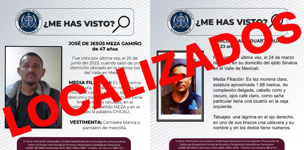 MEXICALI, B.C. Derivado del seguimiento a las pesquisas que la Unidad Especializada para la Investigación y Persecución de Delitos de Desaparición Forzada y Desaparición Cometida por Particulares de la Fiscalía General del Estado lleva a cabo, se logró la localización de dos masculinos que contaban con reporte de búsqueda.