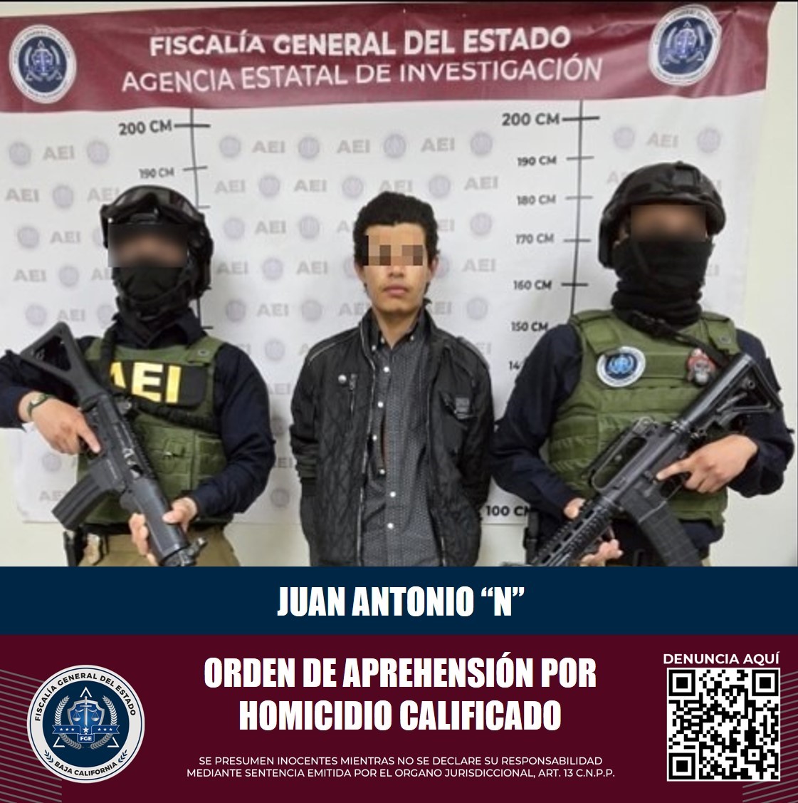 Explicó que la aprehensión derivó de las indagatorias realizadas por la AEI, tras su presunta participación en un crimen ocurrido el pasado 4 de enero de 2024, donde falleció el de nombre Aurelio, en la colonia Tepeyac de Tecate. Juan Antonio "N" ya ha sido puesto a disposición del Juez de Control que ordenó su captura.