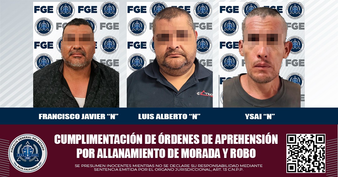 MEXICALI, B.C. Producto del trabajo de elementos investigadores adscritos a la Fiscalía Regional de Mexicali, se logró la captura de tres sujetos que contaban con mandamiento judicial, por los delitos de robo a casa habitación con violencia, robo y allanamiento