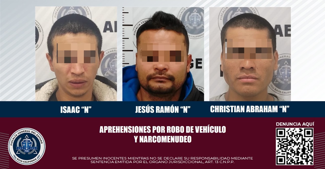 TIJUANA, B.C. Labor de gabinete y campo desarrollada por elementos de la Fiscalía General del Estado (FGE), llevó a la aprehensión de tres individuos que contaban con orden de aprehensión, dos investigados por robo de vehículo y uno por narcomenudeo.