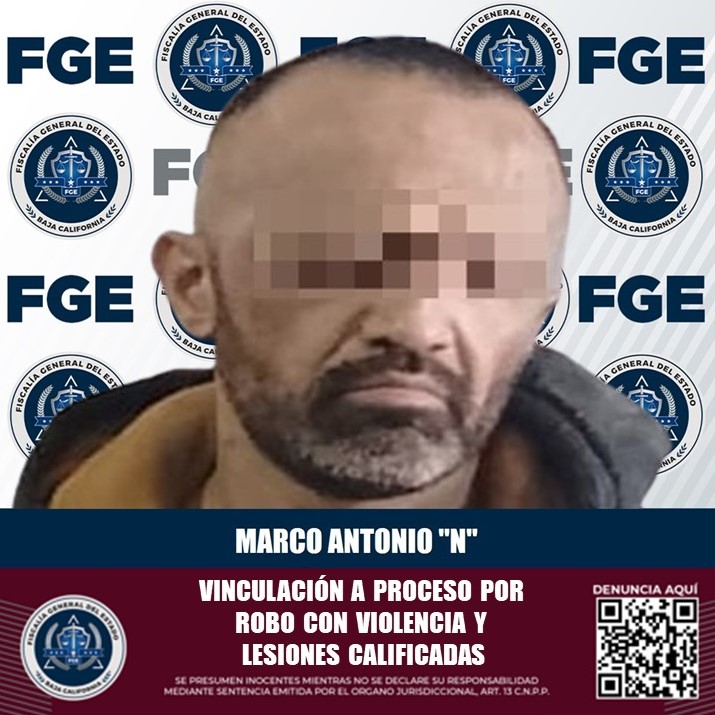 TIJUANA, BAJA CALIFORNIA.- La Fiscalía General del Estado informa que, como resultado del trabajo del Ministerio Público en la audiencia de vinculación, Marco Antonio “N” quedó sujeto a proceso penal por su presunta participación en los delitos de robo con violencia y lesiones calificadas.