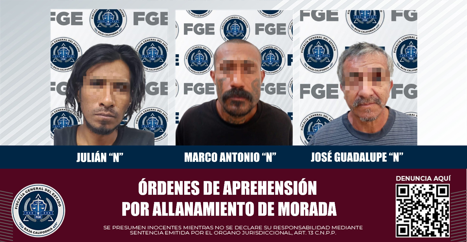MEXICALI, BAJA CALIFORNIA.- Elementos de la Fiscalía Regional de Mexicali, cumplimentaron tres órdenes de aprehensión en contra de igual número de individuos por el delito de allanamiento de morada.