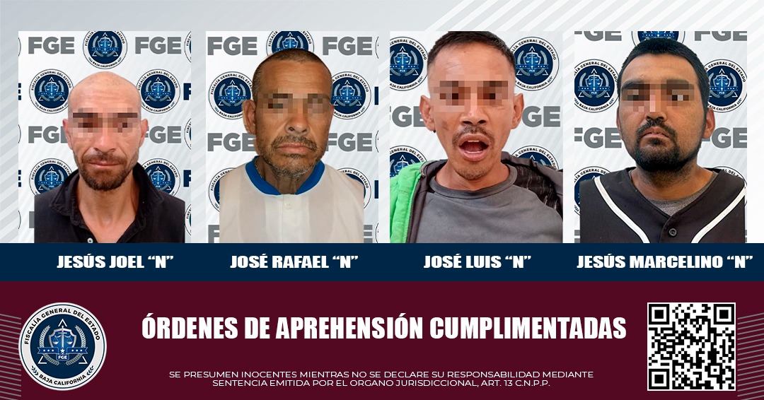 MEXICALI, BAJA CALIFORNIA.- Elementos de la Fiscalía General del Estado (FGE), detuvieron a cuatros sujetos que eran buscados por contar con una orden de aprehensión por delitos diversos.