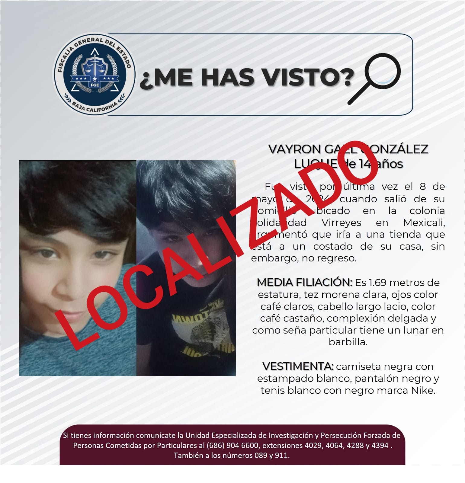 A través de la labor de inteligencia, el personal de la Unidad Especializada para la investigación y Persecución de Delitos de Desaparición Forzada de Personas y Desaparición Cometida por Particulares, fue ubicado sano y salvo Vayron Gael González Luque, en las inmediaciones de la colonia Vista del Valle perteneciente a la delegación El Niño, en la ciudad de Tijuana.