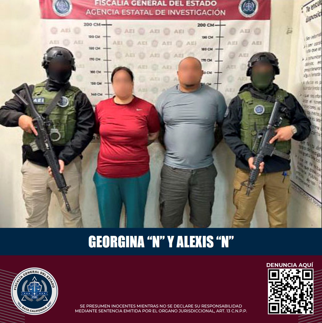 La Fiscal informó a los medios de comunicación que, como resultado de esta investigación, Georgina “N” y su esposo Alexis “N” fueron detenidos y puestos a disposición de un Juez para que respondan por el delito que se les imputa; la menor quedó a disposición del DIF para su atención y protección.