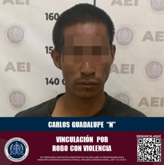ENSENADA, B.C. La Fiscalía Regional de Ensenada logró la vinculación a proceso y medida cautelar de prisión preventiva contra Carlos Guadalupe “N”, de 29 años de edad, detenido en flagrancia por el delito de robo con violencia.