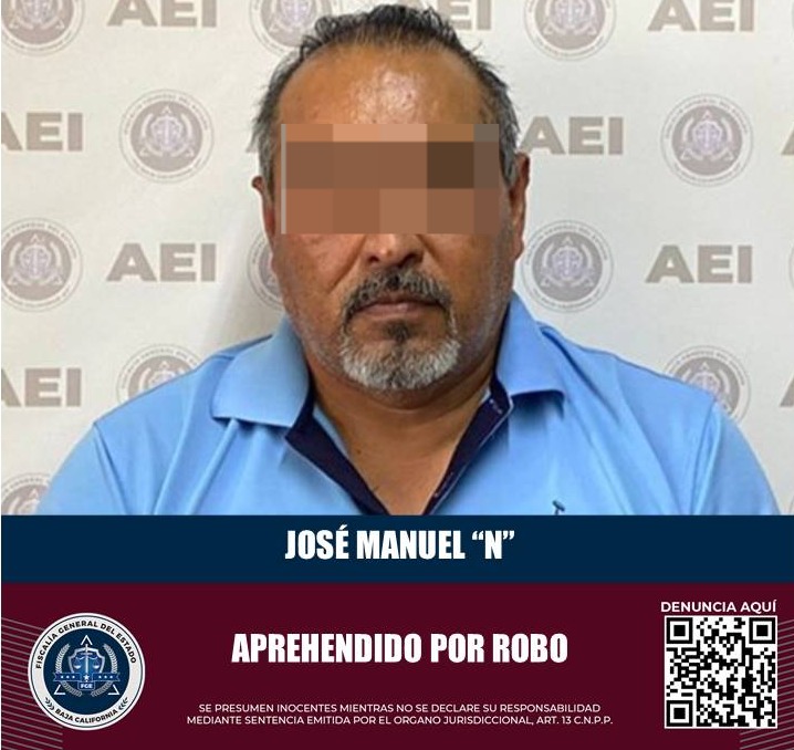 ENSENADA, B.C. Elementos de la Agencia Estatal de Investigación cumplimentaron una orden de aprehensión contra José Manuel “N”, tras su presunta participación en el robo de diversos dispositivos ocurrido en un domicilio de la colonia Valle Verde.