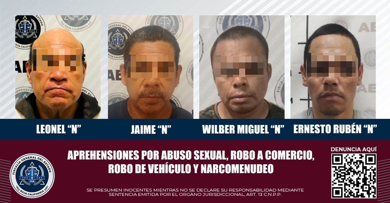 TIJUANA, B.C. La Fiscalía General del Estado informa sobre la detención de cuatro individuos, resultado de la labor de detectives de la Agencia Estatal de Investigación (AEI).