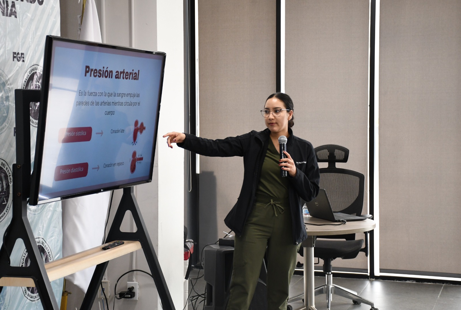 La primera plática, titulada "Hipertensión Arterial: Mejorando tu Estilo de Vida", fue impartida por la Dra. María Teresa Rosales Barajas y la Dra. Priscila Rodríguez Torres. Además, la psicóloga adscrita a la Fiscalía General del Estado, Anahy Aguilar Turrado, presentó el tema "El Impacto de la Salud Mental en la Vida Cotidiana".